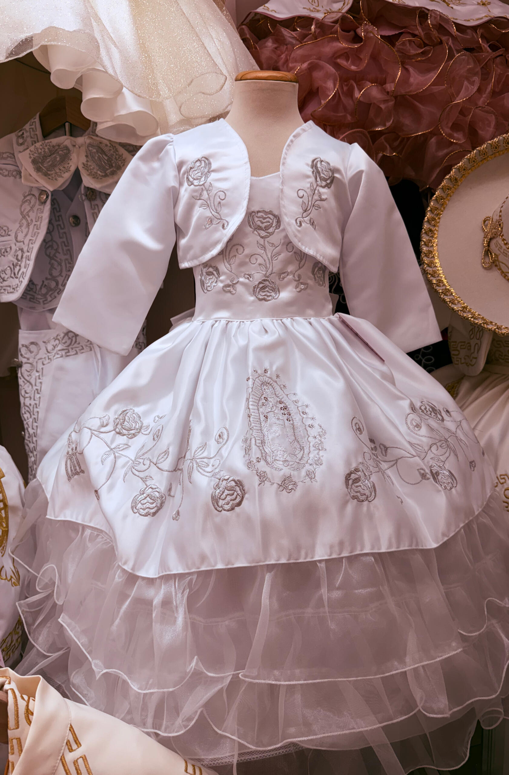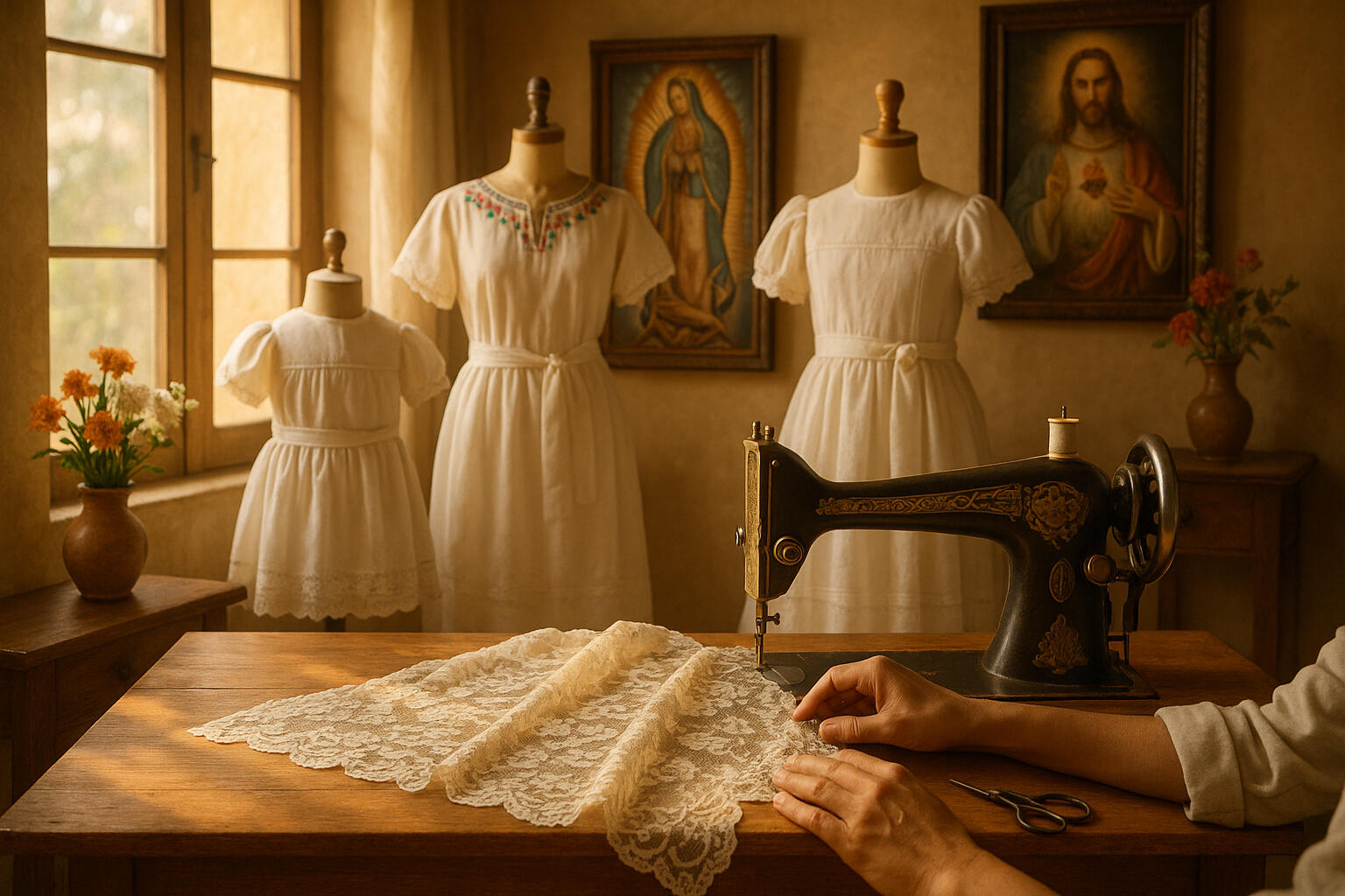 Cada prenda está elaborada a mano por artesanos expertos en México, combinando la tradición católica, la fe y la belleza del arte mexicano en diseños atemporales.Desde delicados vestidos de encaje hasta trajes tradicionales mexicanos, nuestras creaciones están hechas para honrar los momentos más sagrados de la vida.
